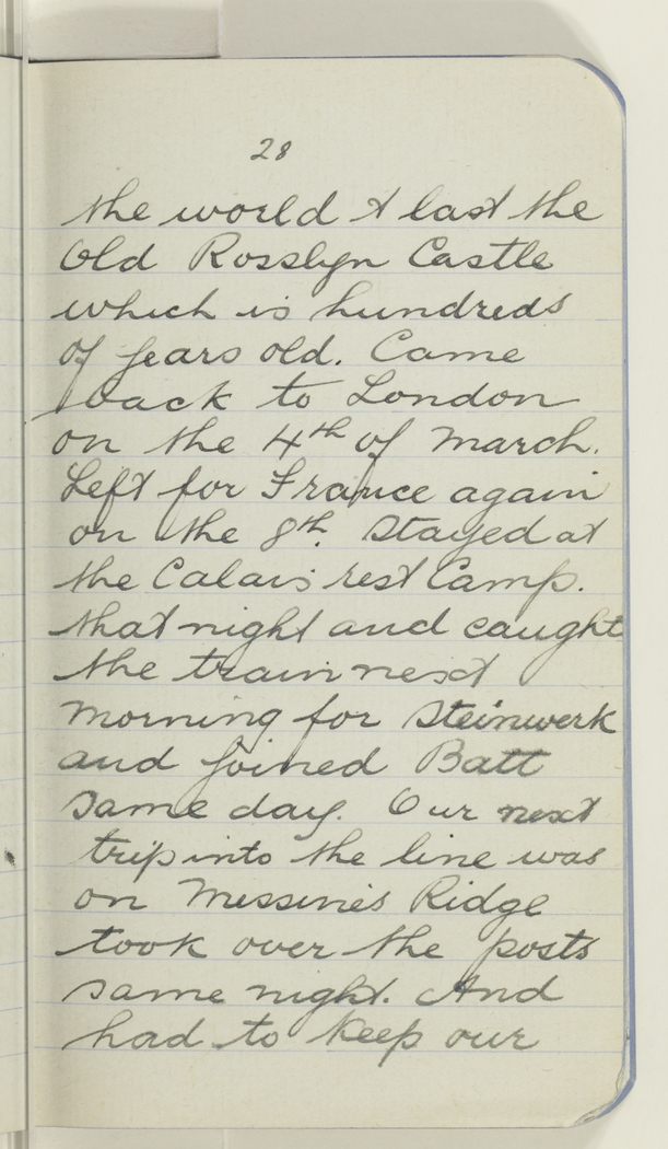 the world & last the Old Rosslyn Castle which is hundreds of years old. Came back to London on the 4th of March. Left for France again on the 8th. Stayed at the Calais rest Camp. that night and caught the train next morning for Steinwerk and joined Batt same day. Our next trip into the line was on Messine's Ridge took over the posts same night. And had to keep our