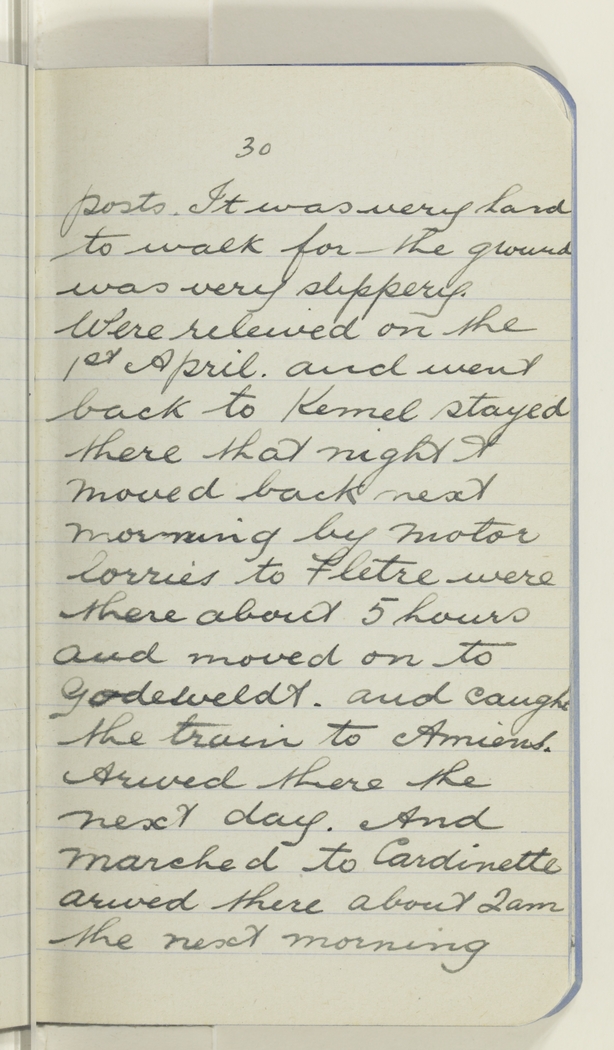 posts. It was very hard to walk for the ground was very slippery. Were releived on the 1st April. and went back to Kemel stayed there that night & moved back next morning by motor lorries to Fletre were there about 5 hours and moved on to Godeweldt. and caught the train to Amiens. Arived there the next day. And marched to Cardinette arived there about 2 am the next morning