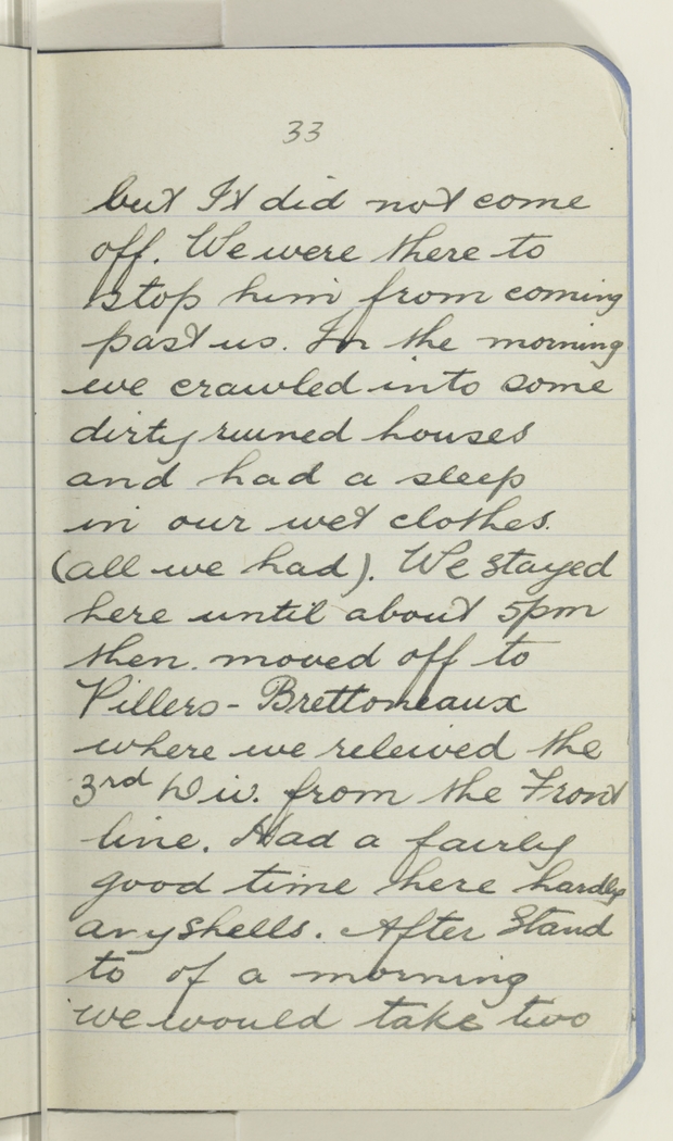 but It did not come off. We were there to stop him from coming past us. In the morning we crawled into some dirty ruined houses and had a sleep in our wet clothes (all we had). We stayed here until about 5 pm then moved off to Pillers - Brettoneaux where we releived the 3rd Div. from the Front line. Had a fairly good time here hardly any shells. After Stand to of a morning we would take two