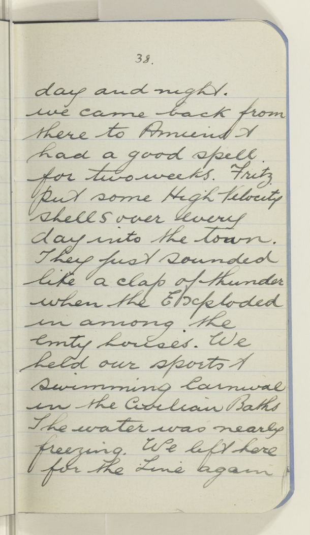day and night. we came back from there to Amiens & had a good spell for two weeks. Fritz put some High Velocity shells over every day into the town. They just sounded like a clap of thunder when the Exploded in among the emty houses. We held our sports & swimming Carnival in the Civilian Baths The water was nearly freezing. We left here for the Line again