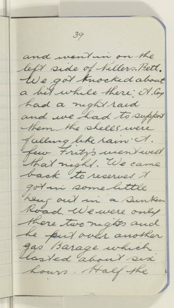 and went in on the left side of Villers. Betl. We got knocked about a bit while there: A. Coy had a night raid and we had to support them the shells were falling like rain. &. few Fritz's went west that night. We came back to reserves & got in some little [heap] out in a Sunken Road. We were only there two nights and he put over another gas Barage which lasted about six hours. Half the