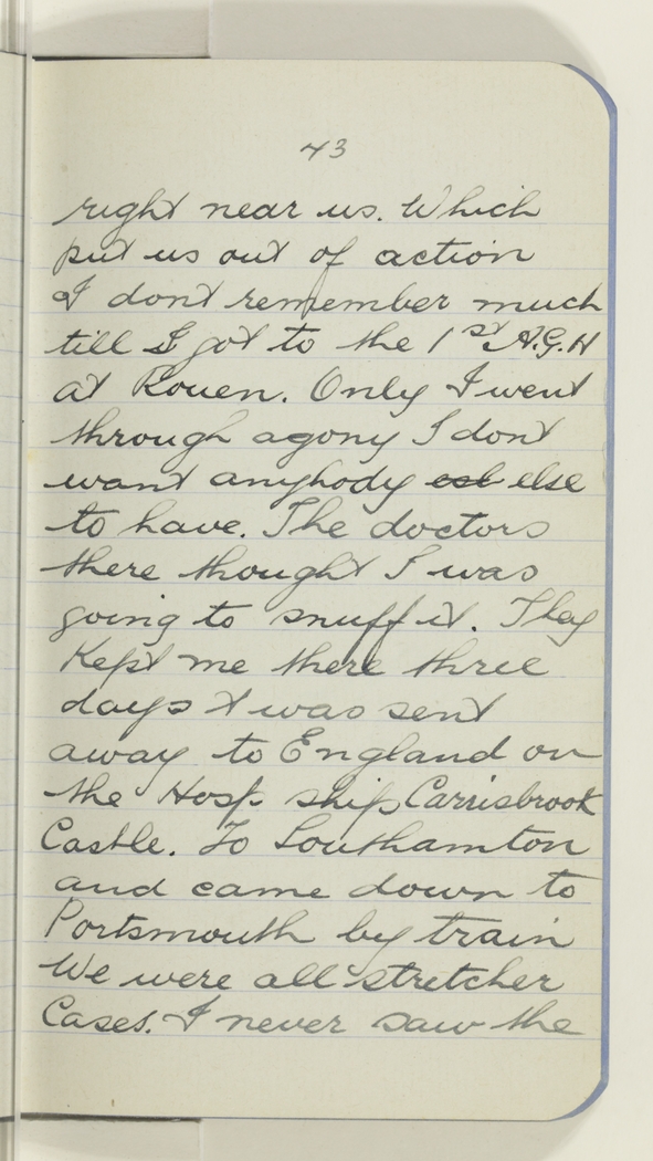 right near us. Which put us out of action I dont remember much till I got to the 1st A.G.H at Rouen. Only I went through agony I dont want anybody esl else to have. The doctors there thought I was going to snuff it. They Kept me there three days & I was sent away to England on the Hosp ship Carrisbrook Castle. To Southamton [Southampton] and came down to Portsmouth by train We were all stretcher Cases. I never saw the