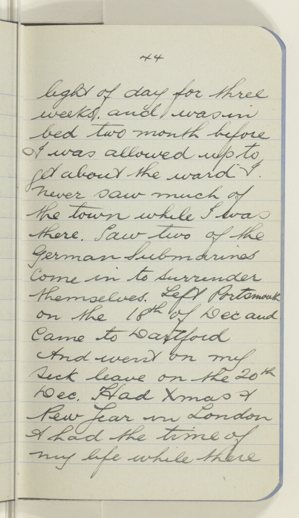 light of day for three weeks. and was in bed two month before I was allowed up to get about the ward I never saw much of the town while I was there. Saw two of the German Submarines come in to surrender themselves. Left Portsmouth on the 18th Dec and Came to Dartford And went on my sick leave on the 20th Dec. Had Xmas & New Year in London & had the time of my life while there