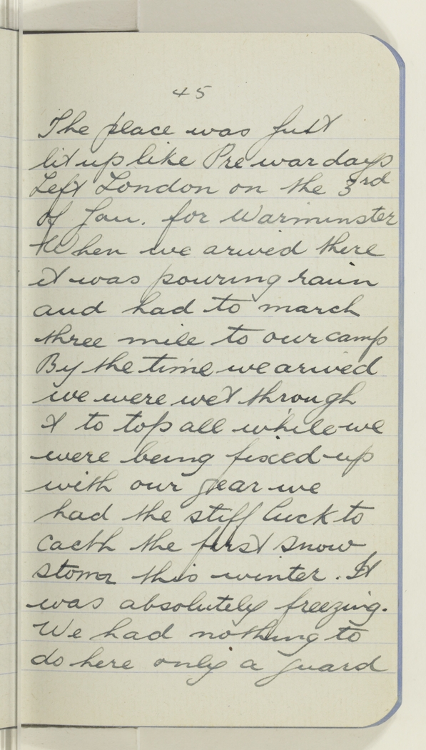 The place was Just lit up like Pre war days Left London on the 3rd Jan. for Warminster When we arived there it was pouring rain and had to march three mile to our camp By the time we arived we were wet through & to top all while we were being fixed up with our gear we had the stiff luck to cacth the first snow storm this winter. It was absolutely freezing. We had nothing to do here only a guard