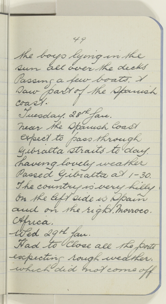Near the Spanish Coast expect to pass through Gibralta straits to day having lovely weather Passed Gibralta at 1-30. The country is very hilly on the left side is Spain and on the right. Morroco [Morocco]. Africa.