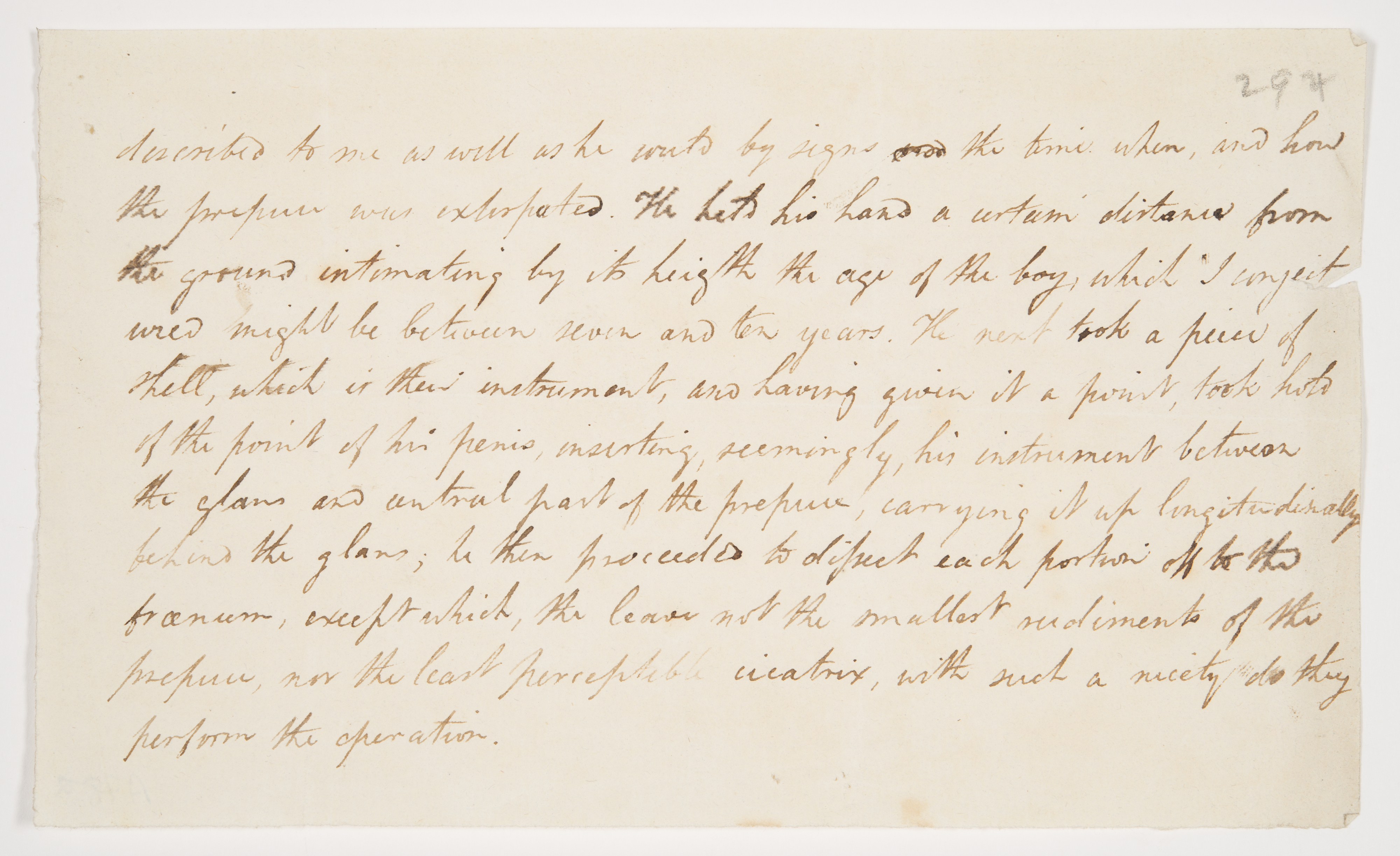 described to me as well as he could by signs from the time when, and how the prepuce was extirpated. He held his hand a certain distance from the ground intimating by its heigth the age of the boy, which I conjectured might be between seven and ten years. He next took a piece of shell, which is their instrument, and having given it a point, took hold of the point of his penis, inserting, seemingly, his instrument between the glans and central part of the prepuce, carrying it up longitudinally behind the glans; he then proceeded to dissect each portion off to the franum, except which, [then] leave not the smallest rudiments of the prepuce, nor the least perceptible cicatrix, with such a nicety do they perform the operation.