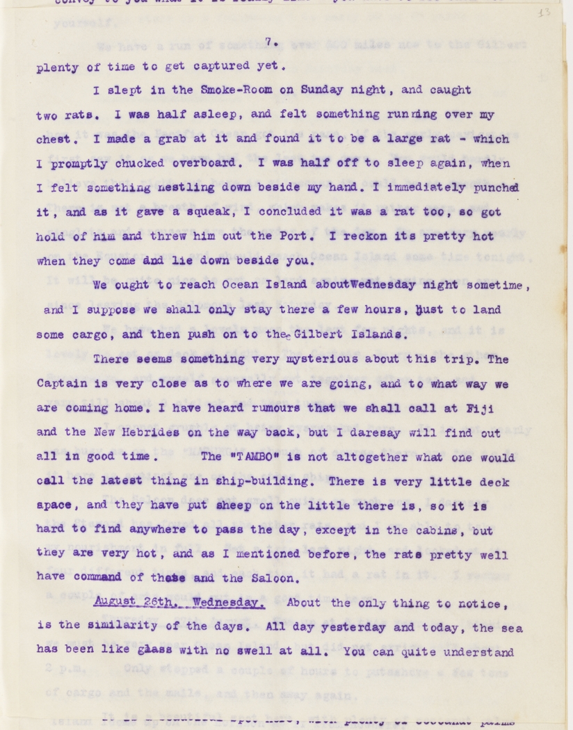 We ought to reach Ocean Island about Wednesday night sometime, and I suppose we shall only stay there a few hours, just to land some cargo, and then push on to the Gilbert Islands.