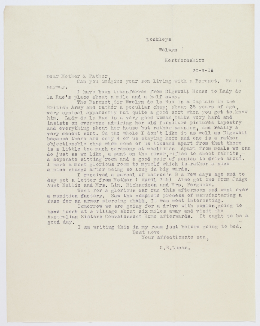 The Baronet, Sir Evelyn de la Rue is a Captain in the British Army and rather a peculiar chap; about 38 years of age, very cynical apparently but quite a good sort when you get to know him. Lady de la Rue is a very good woman, talks very hard and insists on everyone admiring her old furniture pictures tapestry and everything about her house but rather amusing, and really a very decent sort. On the whole I don't like it as well as Digswell because there are only 4 of us staying here and one is a rather objectionable chap whom none of us like and apart from that there is a little too much ceremony at mealtimes Apart from meals we can do just as we like, a punt on the river, rifles to shoot rabbits, a separate sitting room and a good pair of ponies to drive about. I have a most glorious room to myself which is rather a nice a nice change after being so long in big wards.