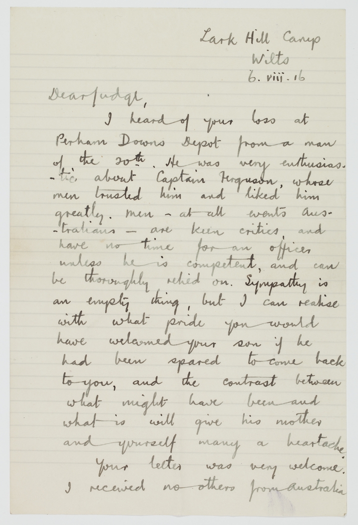 I heard of your loss at Perham Downs Depot from a man of the 20th. He was very enthusiastic about Captain Ferguson, whose men trusted him and liked him greatly. Men – at all events Australians – are keen critics, and have no time for an officer unless he is competent, and can be thoroughly relied on. Sympathy is an empty thing, but I can realise with what pride you would have welcomed your son if he had been spared to come back to you, and the contrast between what might have been and what is will give his mother and yourself many a heartaches.