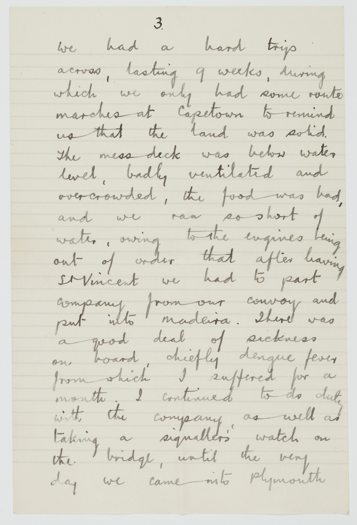 We had a hard trip across, lasting 9 weeks, during which we only had some route marches at Capetown to remind us that the land was solid. The mess deck was below water level, badly ventilated and overcrowded, the food was bad, and we ran so short of water, owing to the engines being out of order that after leaving St Vincent we has to part company from our convoy and put into Maderia. There was a good deal of sickness on board, chiefly dengue fever from which I suffered for a month. I continues to do duty with the Company, as well as taking a signaller's watch on the bridge, until the very day we came into Plymouth