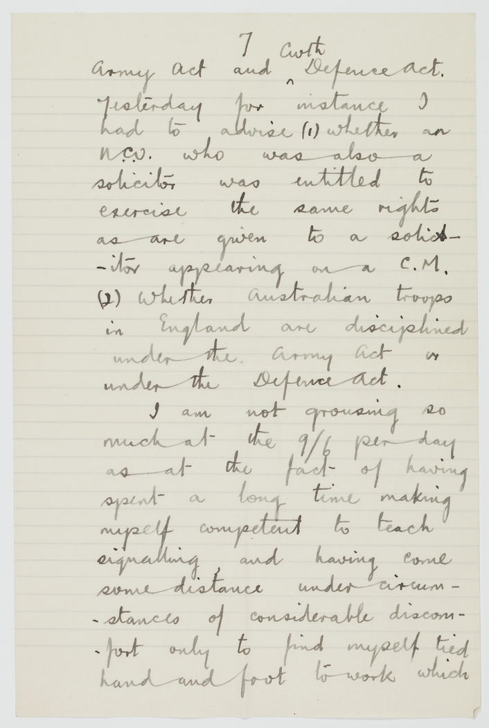 Yesterday for instance I had to advise (1) whether an N.C.O. who was also a solicitor was entitled to exercise the same rights as are given to a solicitor appearing on a C.M. (2) Whether Australian troops in England are disciplined under the Army Act or under the Defence Act.