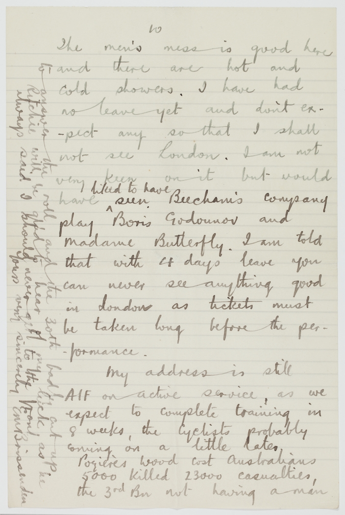 The men's mess is good here and there are hot and cold showers. I have had no leave yet and don't expect any so that I shall not see London. I am not very keen on it but would have like to have seen Beecham's Company play Boris Godounov [Godunov] and Madame Butterfly. I am told that with 4 days leave you can never see anything good in London as tickets must be taken long before the performance.