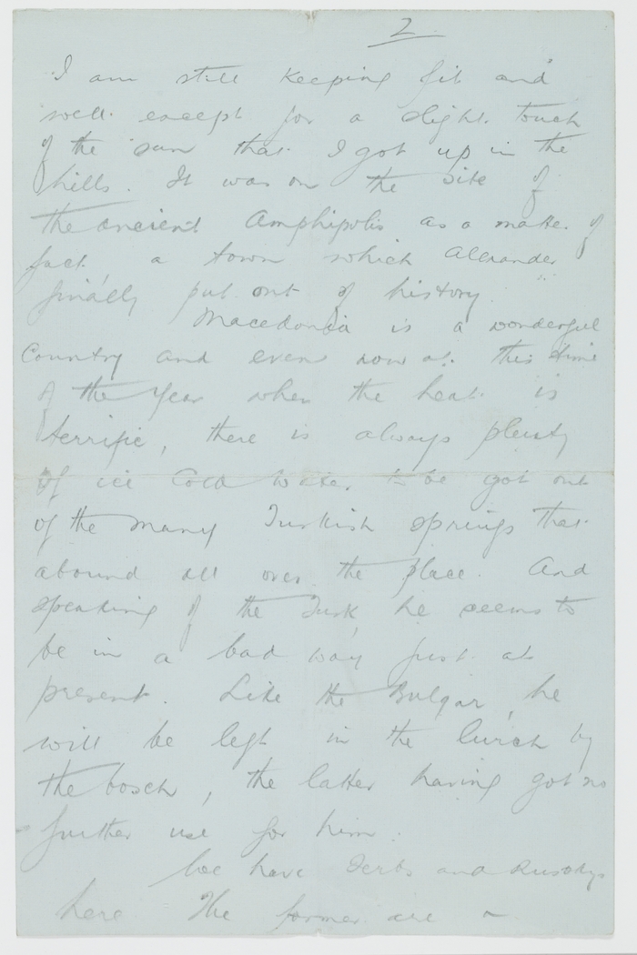 I am still keeping fit and well except for a slight touch of the sun that I got up in the hills. It was on the site of the ancient Amphipolis as a matter of fact, a town which Alexander finally put out of history.