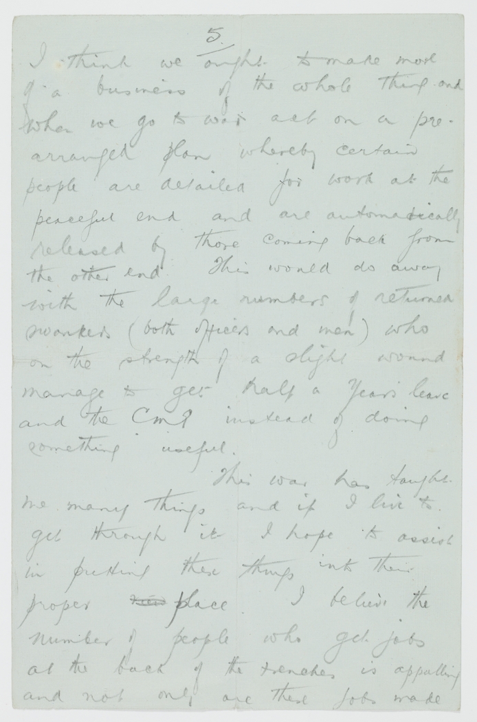 I think we ought to make more of a business of the whole thing and when we go to war act on a prearranged plan whereby certain people are detailed for work at the peaceful end and are automatically released by those coming back from the other end. This would so away with the large numbers of returned wankers (both officers and men) who on the strength of a slight wound manage to get half a Year's leave and the CMD instead of doing something useful.