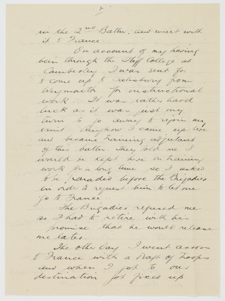 On account of my having been through the Staff College at Camberley I was sent for to come up to Salisbury from Weymouth for instructional work. It was rather hard luck as it was just my turn to go away to rejoin my unit. Anyhow I came up here and became training adjutant of this battn. they told me I would be kept here on training work for a long time so I asked to be paraded before the Brigadier in order to request him to let me go to France.