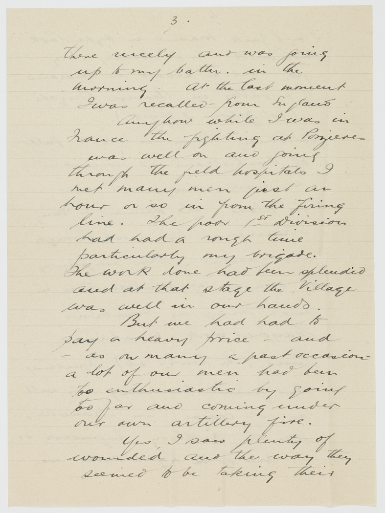 While I was in France the fighting at Pozieres was well on and going through the field hospitals I met many men just an hour or so from the firing line. The poor 1st Division had had a rough time particularly my brigade. The work done had been splendid and at that stage the village was well in our hands.