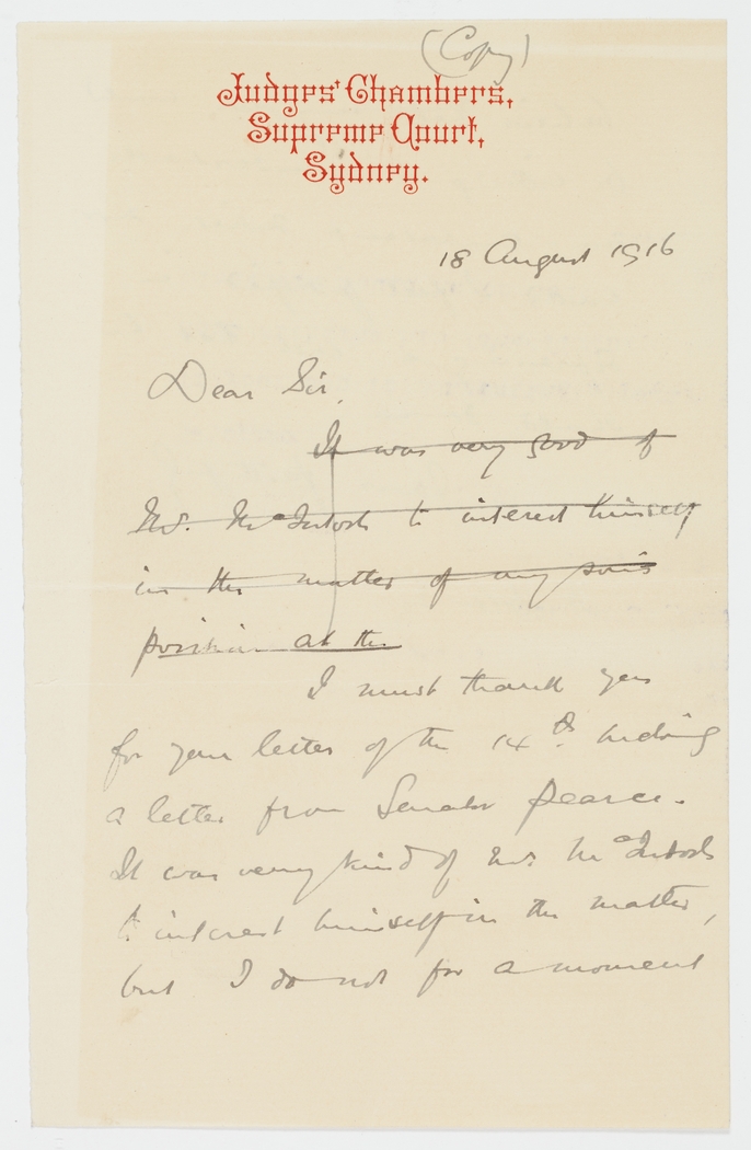 I must thank you for your letter of the 14th including a letter from Senator Pearce. It was very kind of Mt McIntosh to interest himself in the matter, but I do not for a moment