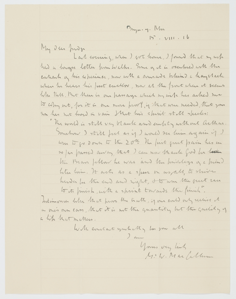 Last evening, when I got home, I found that my wife had a longer letter from Walker. Some of it is occluded with the content of his experiences, now with a command behind & haystack when he hears his first cuckoo, now at the front where it seems like Hell. But there is one passenger which my wife has asked me to whey out, for it is one more proof, if that were needed, that you son has not lived in vain & that his spirit still speaks: