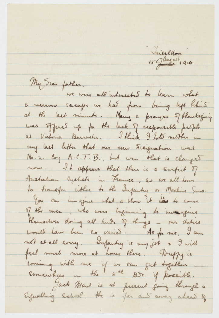We were all interested to learn what a narrow escape you had from being left behind at the last minute. Many a prayer of thanksgiving was offered up for the lack of responsible people at Victoria Barracks. I think I told mother in last letter that our new designation was No. 2. Coy A.C.T.B., but even that is changes now. It appears that there is a surfeit of Australian Cyclists in France, so we all have to transfer either to the Infantry or Machine Guns.