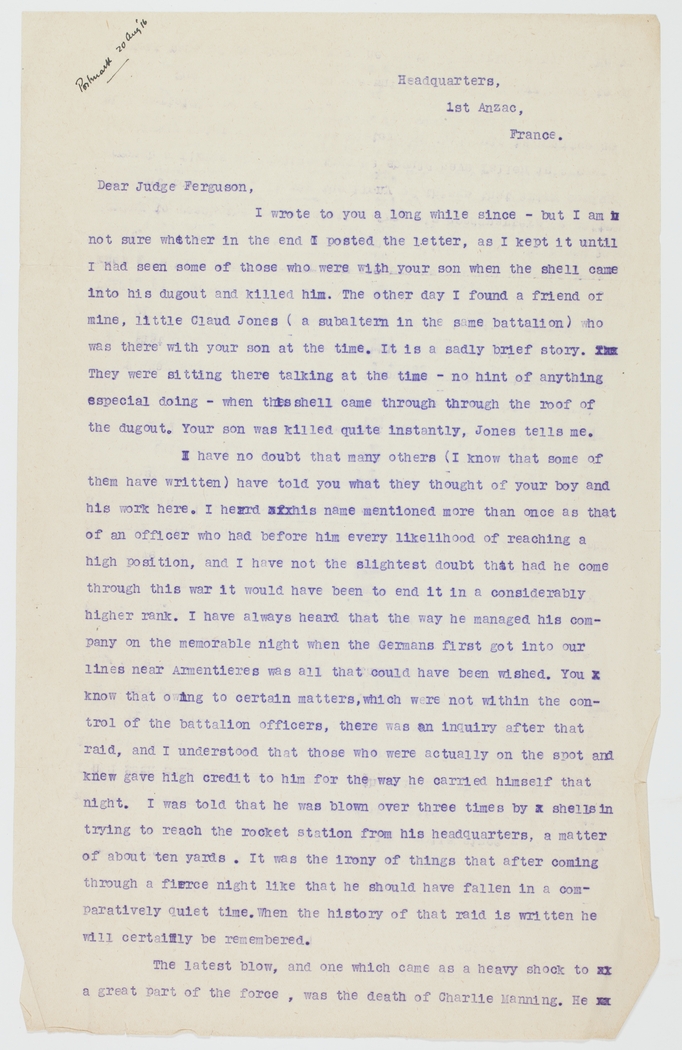 I have no doubt that many others (I know that some of them have written) have told you what they thought of your boy and his work here. I heard his name mentioned more than once as that of an officer who had before him every likelihood of reaching a high position, and I have not the slightest doubt that had he come through this war it would have been to end it in a considerably higher rank. I have always heard that the way he managed his company on the memorable night when the Germans first got into our lines near Armentieres was all that could have been wished. You know that owing to certain matters, which were not within the control of the battalion officers, there was an inquiry after that raid, and I understand that those who were actually on the spot and knew gave high credit to him for the way he carried himself that night. I was told that he was blown over three times by shells in trying to reach the rocket station from his headquarters, a matter of about ten yards. It was the irony of things that after coming through a fierce night like that he should have fallen in a comparatively quiet time. When the history of that raid is written he will certainly be remembered.