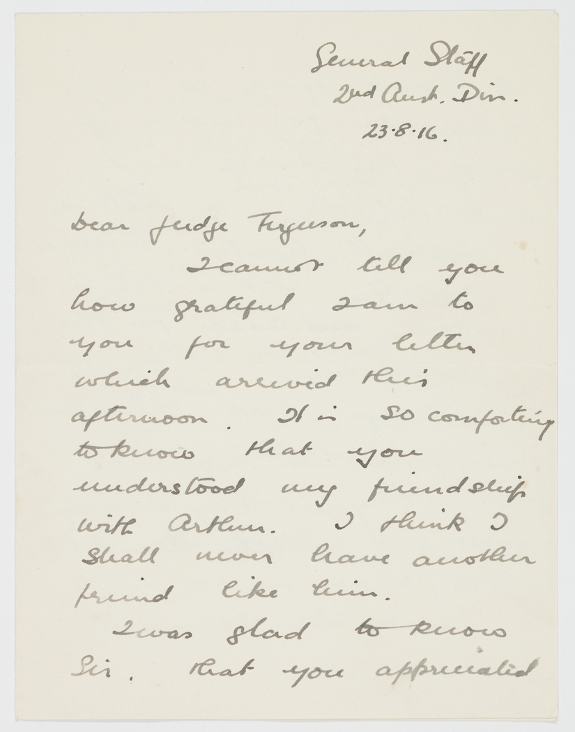 I cannot tell you how grateful I am to you for your letter which arrived this afternoon. It is so comforting to know that you understood my friendship with Arthur. I think I shall never have another friend like him.