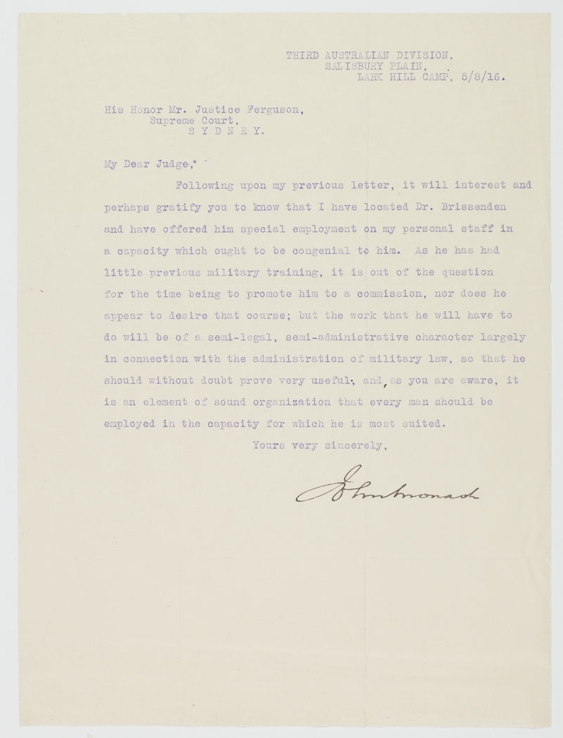 Following upon my previous letter, it will interest and perhaps gratify you to know that I have located Dr. Brissenden and have offered his special employment on my personal staff in a capacity which ought to be congenial to him. As he had had little previous military training, it is out of the question for the time being to promote him to a commission, nor does he appear to desire that course; but the would that he will have to do will be of a semi-legal, semi-administrative character largely in connection with the administration of Military law, so that he should without doubt prove very useful, and, as you are aware, it is an element of sound organisation that every man should be employed in the capacity for which he is most suited.