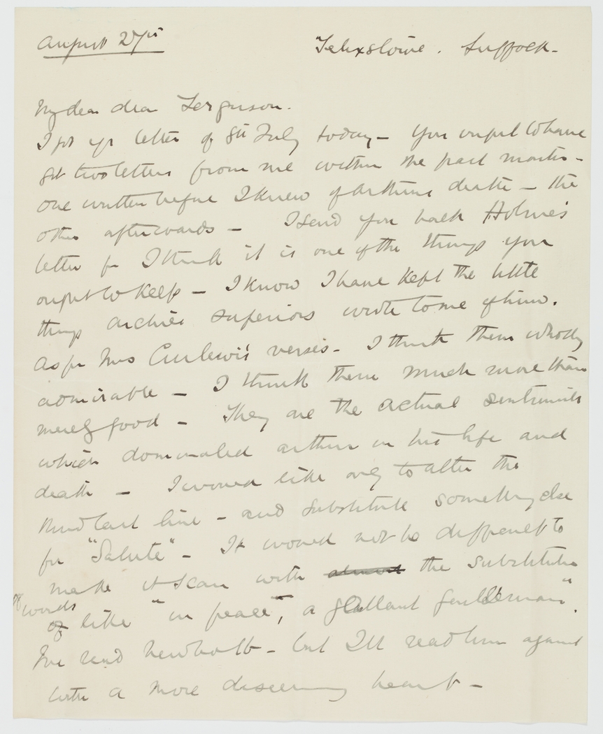 I got your letter of 8th July today – Your input to have got two letters from me within the past months – one written before I knew of Arthurs death – the other afterwards – I send you back Arthur's letter for I think it is one of the things would ought to keep – I know I have kept the little things Archies superiors to me of him. As for Mrs Curlewis' verses – I think them wholly admirable. I think them much more than merely food – They are the actual sentiments which dominated Arthur in his life and death – I would like only to alter the [indecipherable] last line – and substitute something else for "Salute" – It would not be different to make it I can with almost the substitute words of like in peace, a gallant gentleman . Ive sent [indecipherable] – but Ill read him against [indecipherable] a more discerning heart.