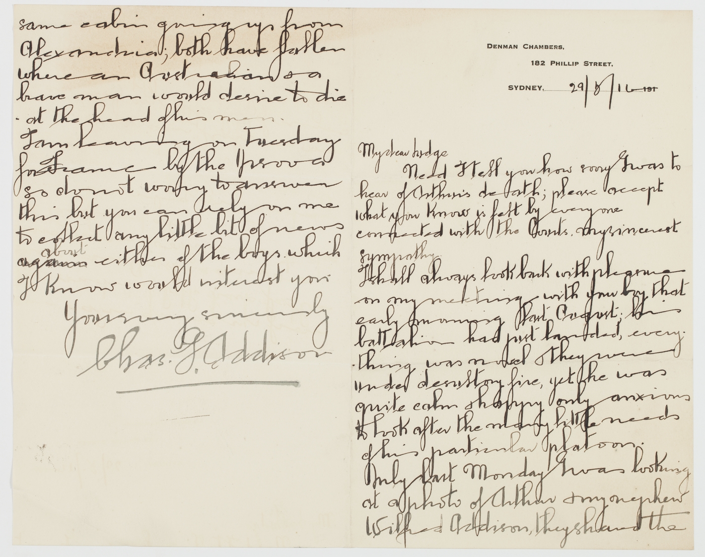 I shall always look back with pleasure on my meeting with your boy that early morning last August. His battalion had just landed, everything was moved & they were under desultory fire, yet he was quite calm & happy only anxious to look after the many little needs of his particular platoon. Only last Monday I was looking at a photo of Arthur & my nephew Will Addison, they shared the same cabin going from Alexandria. Both have fallen when an Australian & a brave man would desire to die – at the head of his men.