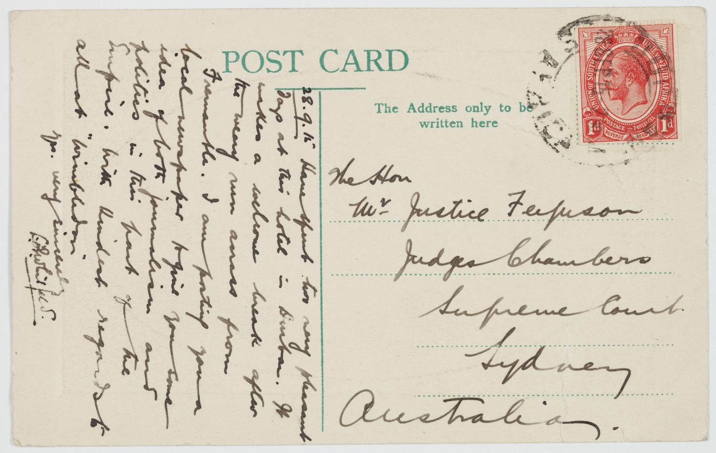 [Postage stamp is 1d stamp for UNION OF SOUTH AFRICA]