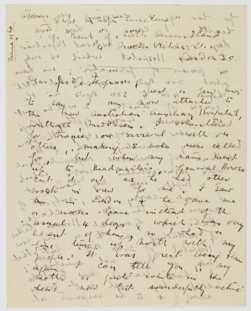 Just a few lines to say I am now attached to the new Australian Auxiliary Hospital, Southall, Middlesex. I volunteered for France on arrival with 4 others, making 5 who were called for, but when my name went up to Headquarters, General Howse cut it out as he has other work in view for me. I saw him in London & he gave me a weeks leave instead of the usual 4 days, which was very decent of him, so I had a fine time up North with my people. It was great seeing them again I can tell you & my mother is quite white in the hand now but wonderfully active