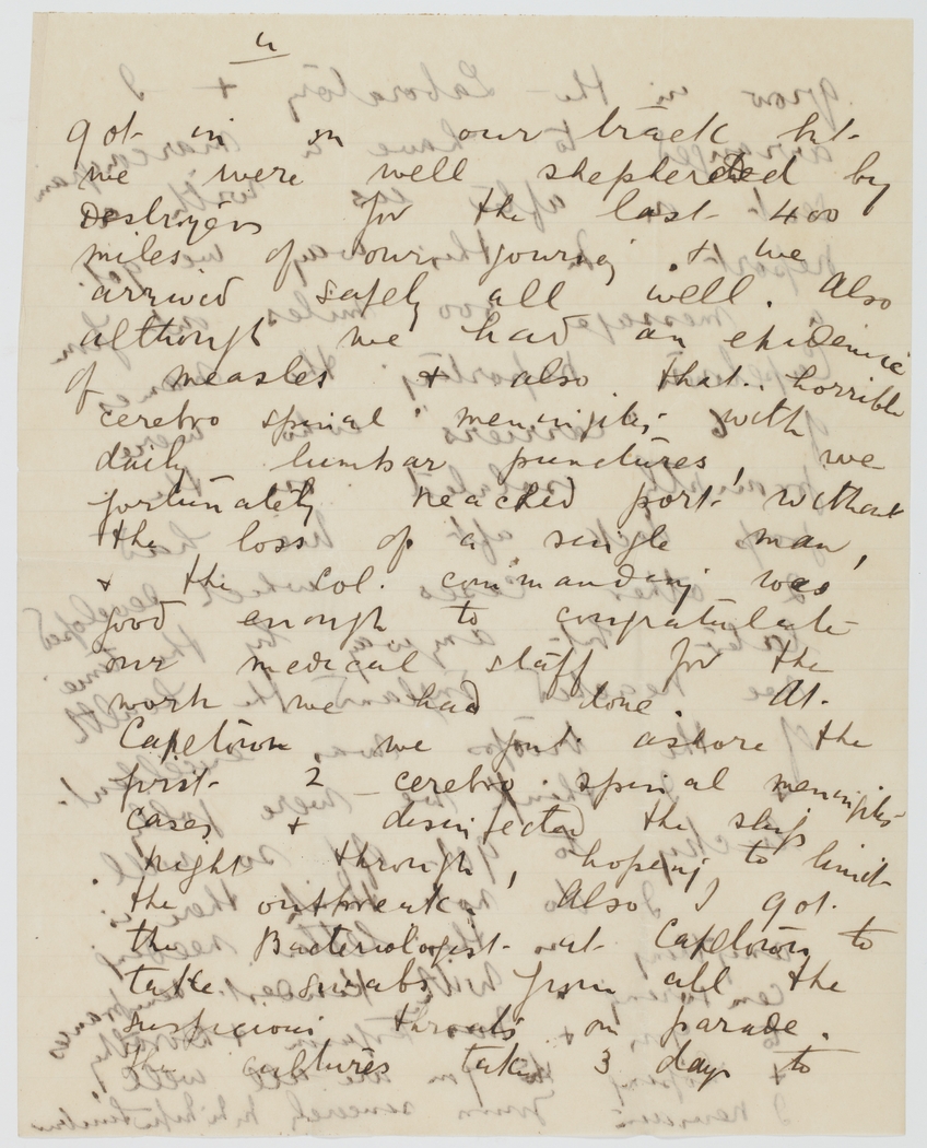 got in on our track but we were well shepherded by Destroyers for the last 400 miles of our journey, & we arrived safely all well. Also although we have an epidemic of measles & also that horrible cerebro spinal meningitis with daily lumbar punctures, we fortunately reached port without the loss of a single man, & the Col. Commanding was good enough to congratulate our medical staff for the work we had done. At Capetown we sent ashore the first 2 cerebro spinal meningitis cases & disinfected the ship right through, hoping to limit the outbreak. Also I got the Bacteriologist at Capetown to take swabs from all the suspicious throats on parade. The cultures take 3 days to