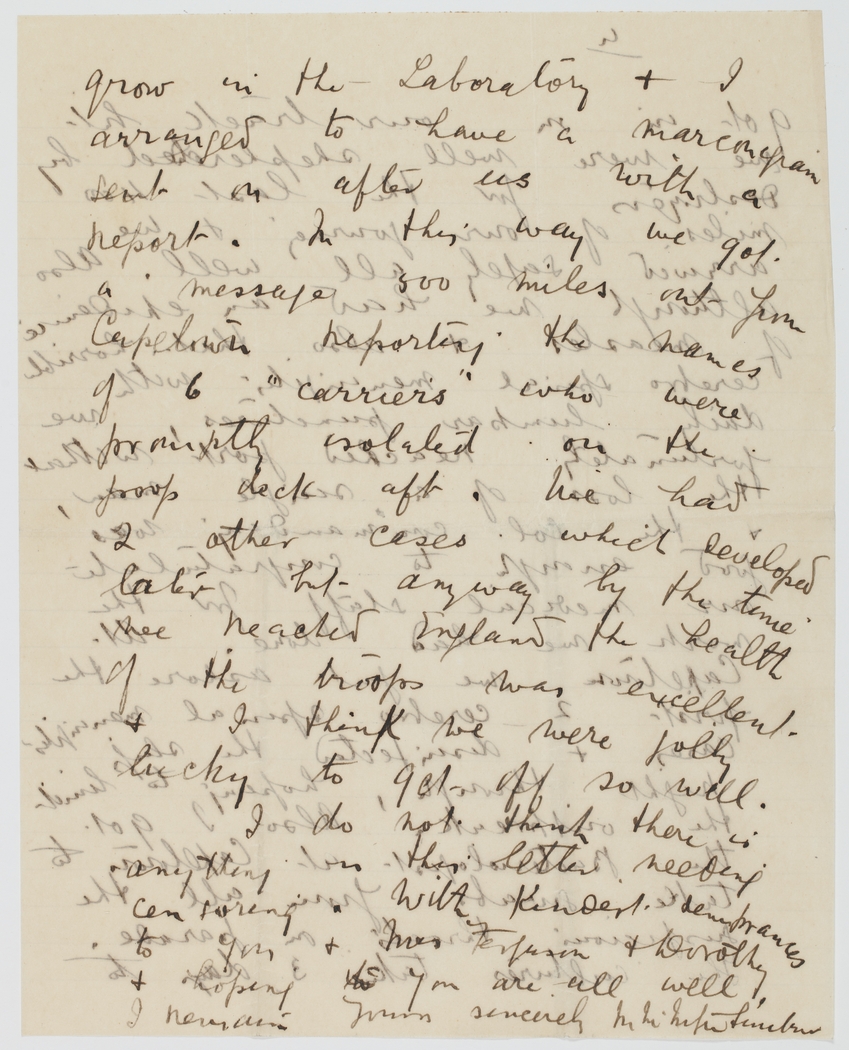 grow in the Laboratory & I arranged to have a marconigram sent on after us with a report. In this way we got a message 800 miles out from Capetown reporting the names of 6 "carriers" who were promptly isolated on the poop deck aft. We had 2 other cases which developed later but anyway by the time we reached England the health of the troops was excellent & I think we were jolly lucky to get off so well.