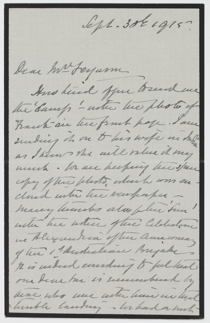 [indecipherable] office to send me the 'Camp' – with the photo of Frank on the fruit page. I am sending it on to his wife in India as I know she will value it very much. We are keeping the spare copy of the photo, which was enclosed with the newspaper – many thanks also [indecipherable] 'Sun" with the notice of the Celebration in Alexandria of the Anniversary of the 1st Australian Brigade – It is indeed unending to feel trial one time is remembered by nine who were with him in that terrible landing - or had a [indecipherable]