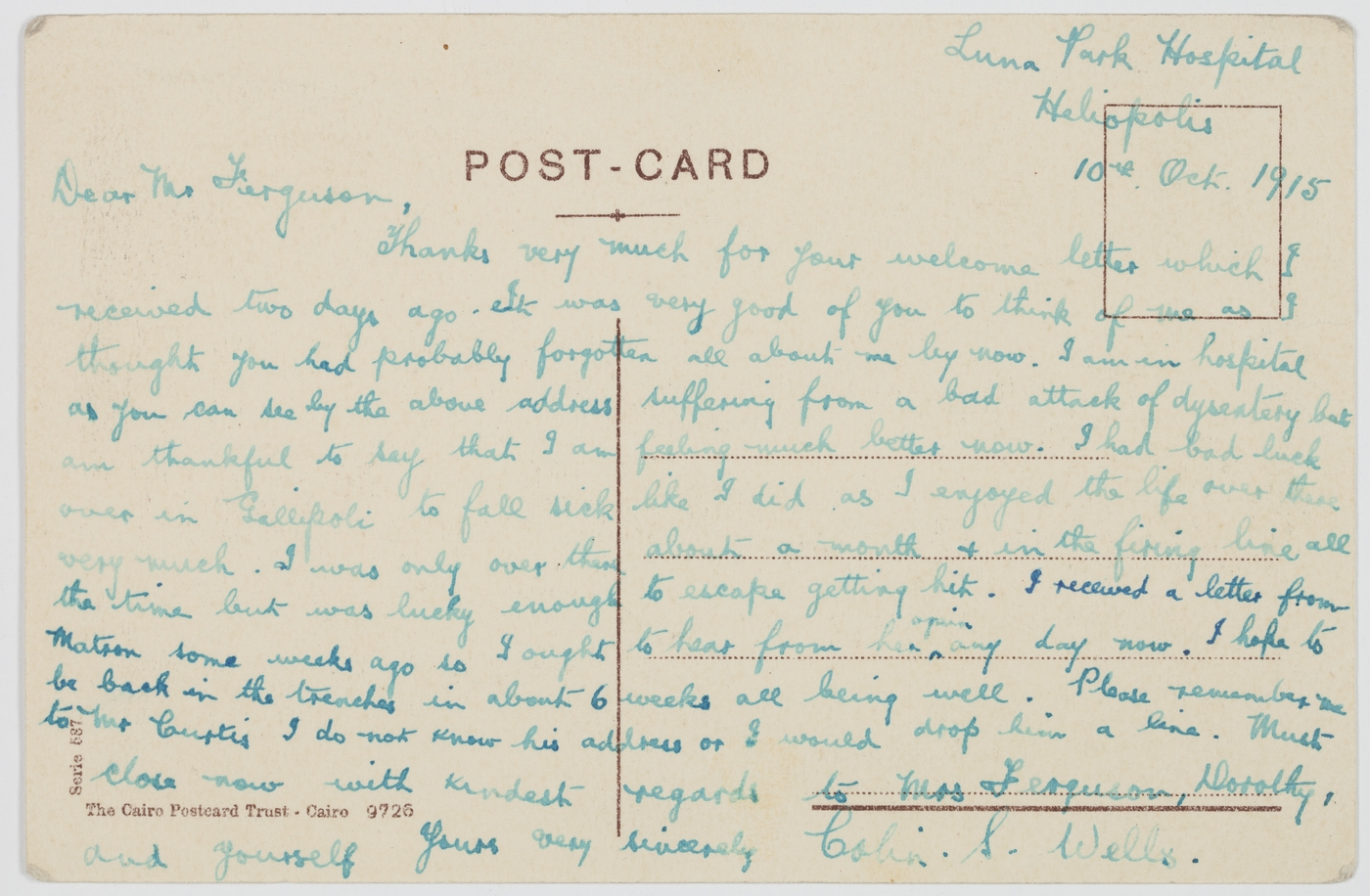 Thank you very much for your welcome letter which I received two days ago – It was very good of you to think of me as I thought you had probably forgotten all about me by now. I am in hospital as you can see by the above address suffering from a bad attack of dysentery but am thankful to say that I am feeling much better now. I had bad luck over in Gallipoli to fall sick like I did as I enjoyed the life over there very much. I was only over there about a month & in the firing line all the time but was lucky enough to escape getting hit. I received a letter from Matron some weeks ago so I ought to hear from her again any day now. I hope to be back in the trenches in about 6 weeks all being well. Please remember me to Mr Curtis I do not know his address or I would drop him a line. Must close now with kindest regards to Mrs Ferguson, Dorothy, and yourself. Yours very sincerely Colin. S. Wells.