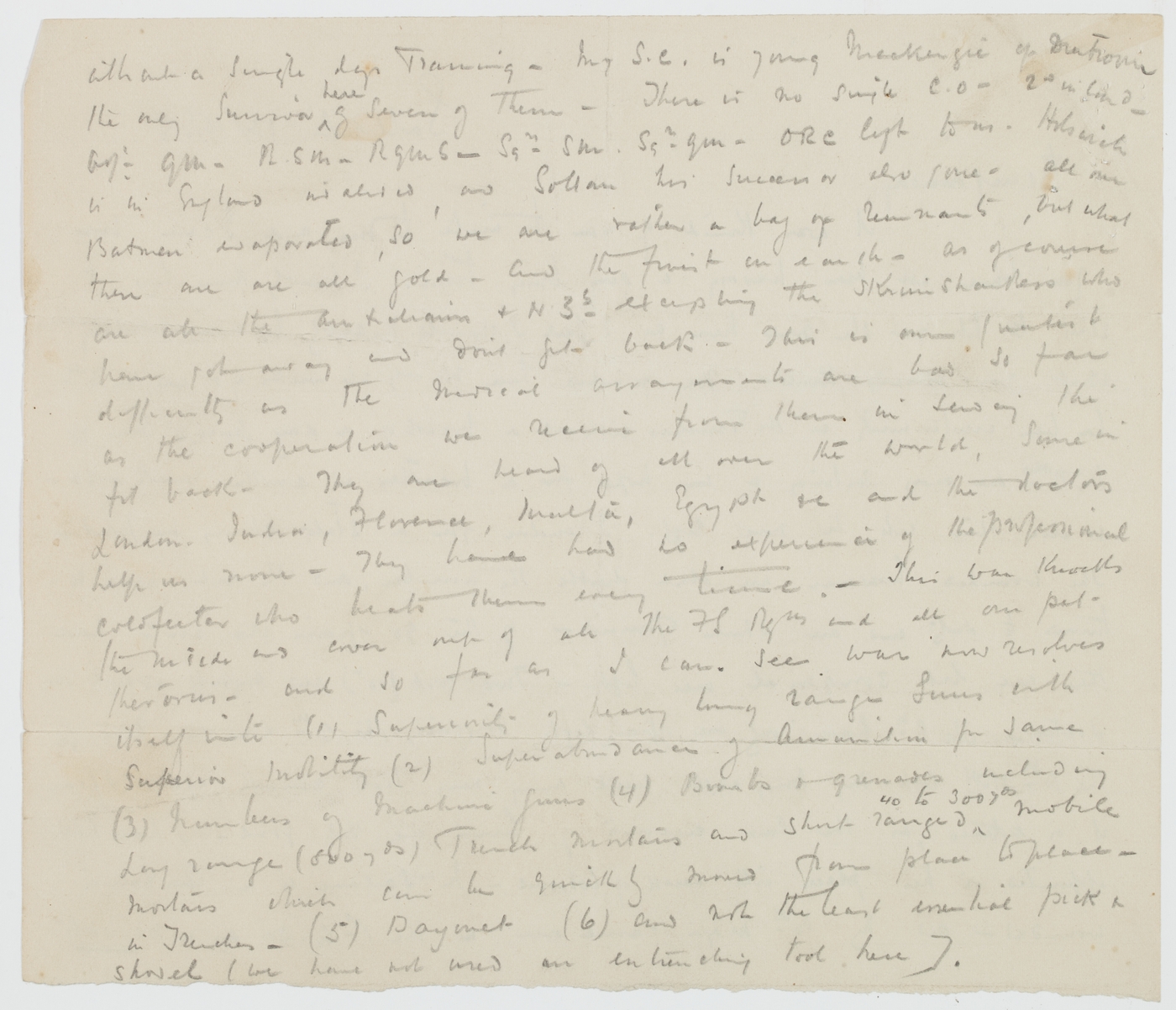 without a single days Training – my S.C. is young Mackenzie of Duntroon the only Survivor here of seven of them – There is no single C.O. – 2nd in Cmd – my qm N.S.W. Rgms – Sqn. S.M. Sqn. qm – ORC left to us. Holswick is in England disabled, and Gollan his successor also gone – all our Batman evaporated, so we are rather a bag of Newnants, but what then are we all gold – And the finest on earth – As of course are all the auxiliaries & N. 3s excepting the 5 Krim shankers who have jobs away and don't get back – This is one I make to difficulty as the ironical arrangements are bad so bad so far as the cooperation we receive from them in sending the fit back- They are heard of all over the world. Some in London, India, Florence, Malta, Egypt etc and the doctors help us none – They have had no experience of the professional coldfector who beats them every time. – This war knocks the mickeing cover out of all. The F.S.Rgms and all our pet theories – and so far as I can see war now resolves itself into (1) Superiority of heavy long range Guns with Superior mobility (2) Superabundances of Ammunition for same (3) Numbers of Machine guns (4) Bombs & grenades including day range (800 yds) Trench mortars and short range 40 to 300 yds Mobile Mortars which can be quickly moved from place to place – in Trenches – (5) Bayonet (6) and not the least essential pick & shovel (we have not used an entrenching tool here).
