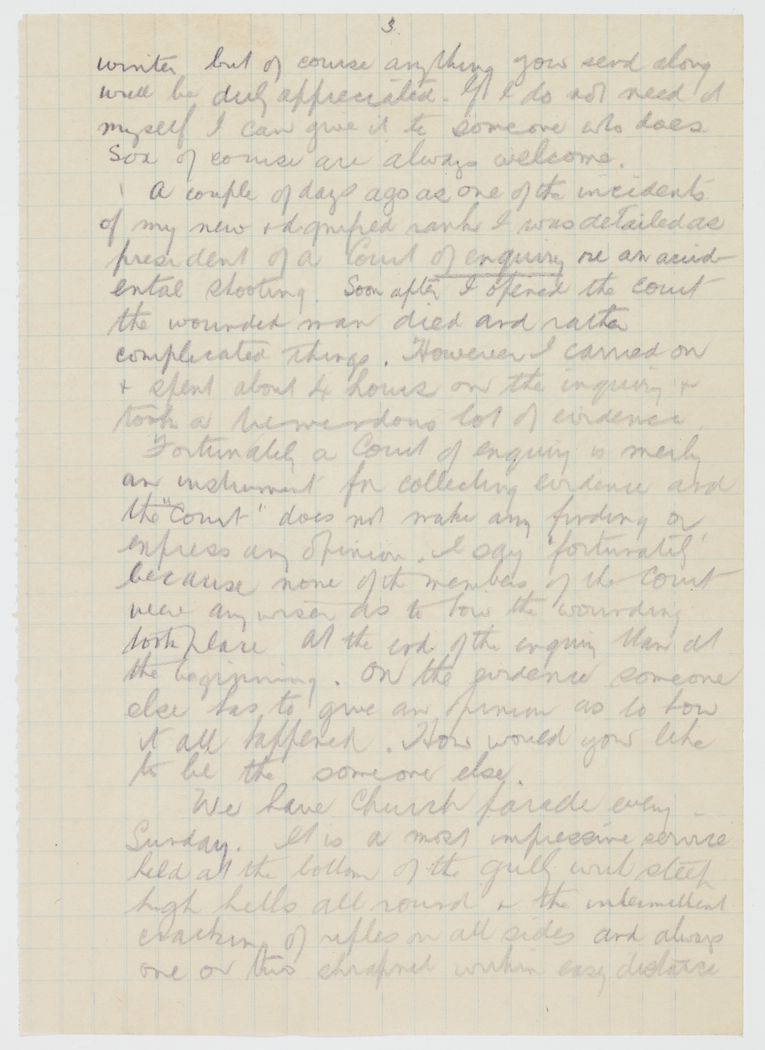 A couple of days ago as one of the incidents of my new & dignified rank I was detailed as President of a Court of enquiry re an accidental shooting. Soon after I opened the court the wounded man died and rather complicated things. However I carried on & spent about 4 hours on the inquiry & took a tremendous lot of evidence.