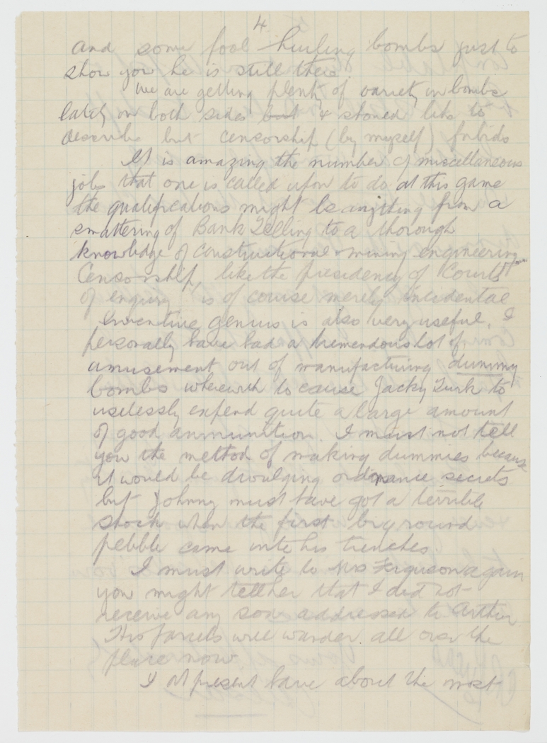 It is amazing the number of miscellaneous jobs that one is called upon to do at this game the qualifications might be anything from a smattering of Bank Telling to a thorough knowledge of construction & mining engineering. Censorship, like the presidency of Courts of enquiry is of course merely incidental. Inventive genius is also very useful, personally have had a tremendous lot of amusement out of manufacturing dummy bombs wherewith to cause Jacky Turk to uselessly expend quite a large amount of good ammunition. I must not tell you the method of making dummies because it would be divulging ordnance secrets but Johnny must have got a terrible shock when the first big round pebble came into his trenches.