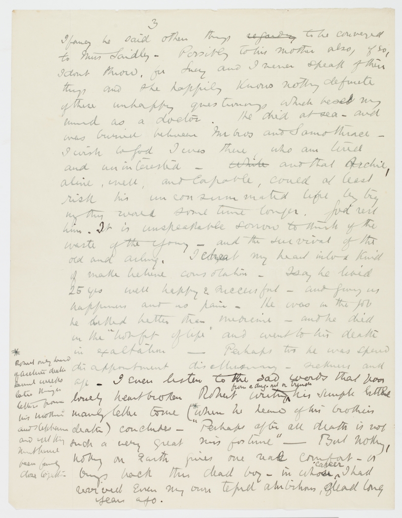 I fancy he said other things regarding to be conveyed to Miss Laidly – Possibly to his mother also, if so, I don't know, for Lindy and I never speak of these things and happily knows nothing definite of these unhappy questionings which beset my mind as a doctor. He died at sea – and was buried between Imbros and Samothrace – I wish to God I was there, who am tired and uninterested - while and that Archie, alive, well, and capable, could at least risk his unconsummated life by trying this world some time longer. God rest him. It is unspeakable sorrow to think of the waste of the young – and the survival of the old and ailing. I cheat my heart inlox kind of make believe consolation. – I say he lived 25 years well happy & successful – and giving us happiness and no pain – He was in the job he liked better then medicine – and he died in the "bonfit of life" and went to his death in exaltation – Perhaps too he was spend disappointment disethening - sickness and all – I even listen to the sad words that poor lovely heartbroken Robert from a dug-out or trench writing his simple little manly letter to me (when he learnt of my brother's death) concludes – "Perhaps after all death is not such a very great misfortune" – But nothing, nothing on earth gives one more comfort – or brings back this dead boy – in whose career I had received even my own tepid ambitions, glad long years ago.