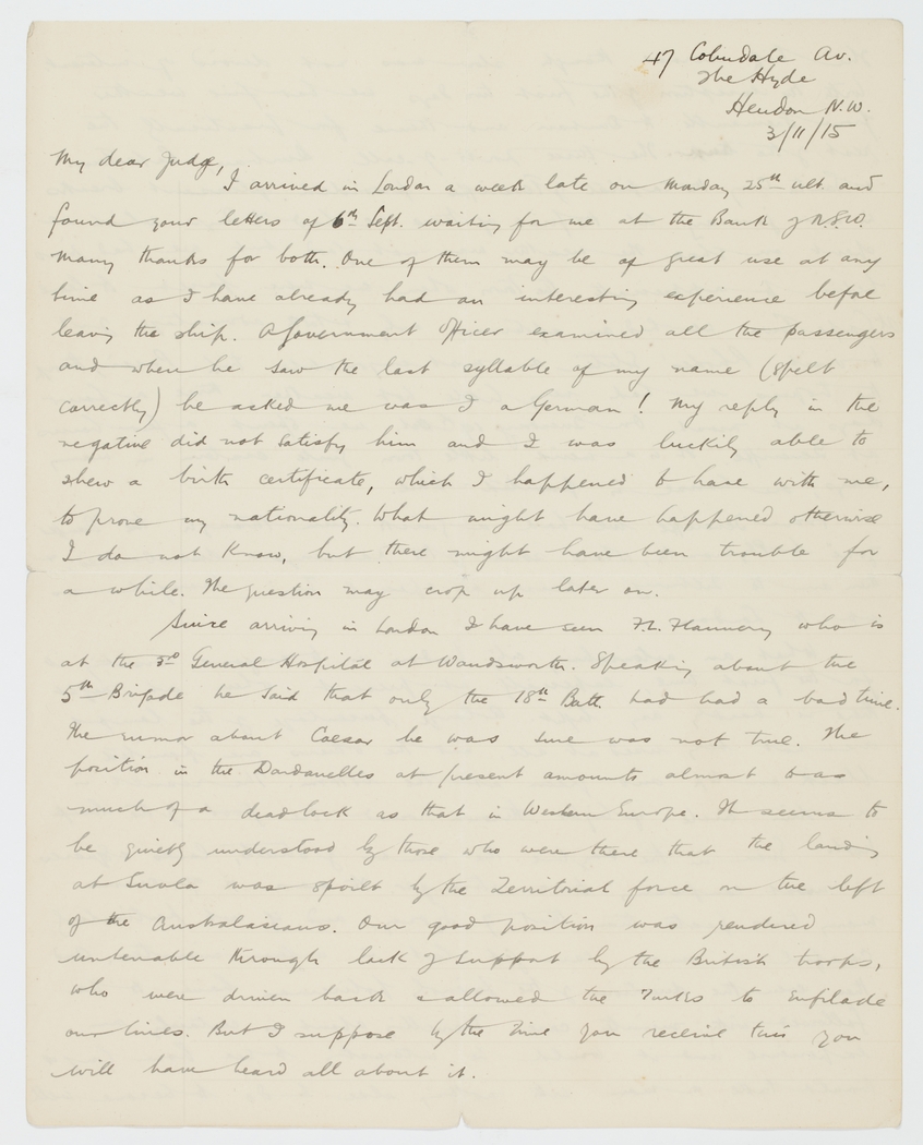 I arrived in London a week late on Monday 25th ult. and found your letters of 6th Sept. waiting for me at the Bank of N.S.W. Many thanks for both. One of them may be of great use at any time as I have already had an interesting experience befall leaving the ship. A Government officer examined all the passengers and when he saw the last syllable of my name (spelt correctly) he asked me was I a German! My reply in the negative did not satisfy him and I was luckily able to shew a birth certificate, which I happened to have with me, to prove my nationality. What might have happened otherwise I do not know, but there might have been trouble for a while. The question may crop up later on.