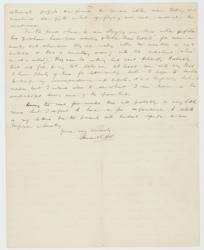 In the house where I am staying are three other pupils two of whom have been waiting to "take their tickets" for over a week, but whenever they are ready either the weather is not suitable or there is something wrong with the machine (or "bus" as it is called). They can do nothing but wait patiently. Probably that will fall to my lot later on. At least you will say that I have plenty of time for letter writing. Well I hope to be able to keep my correspondence up to date – it is a long way behind now – but I intend also to see what I can learn in the workshops during some of the spare time.