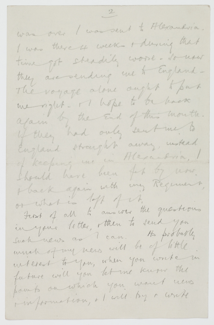 was over I was sent to Alexandria. I was there 4 weeks & during that time got steadily worse – so now they are sending me to England – the voyage alone ought to put me right - & I hope to be back again by the end of this month. If they had only sent me to England straight away, instead of keeping me in Alexandria, I should have been fit my now, & back again with my Regiment, or what is left of it.