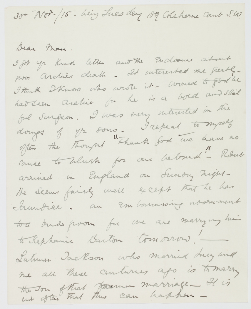 I got yr kind letter and the enclosure about poor Arthur's death. It interested me greatly – I think I know who wrote it – would to God he had seen Arthur for he is a bold and skilful Surgeon. I was very interested in the doings of yr sons. I repeat to myself often the thought "Thank God we have no cause to blush for one beloved" – Robert arrived in England on Sunday night – He seems fairly well except that he has Jaundice – an embarrassing adornment to a bridegroom for we are marrying him to Stephanie Barton tomorrow! –