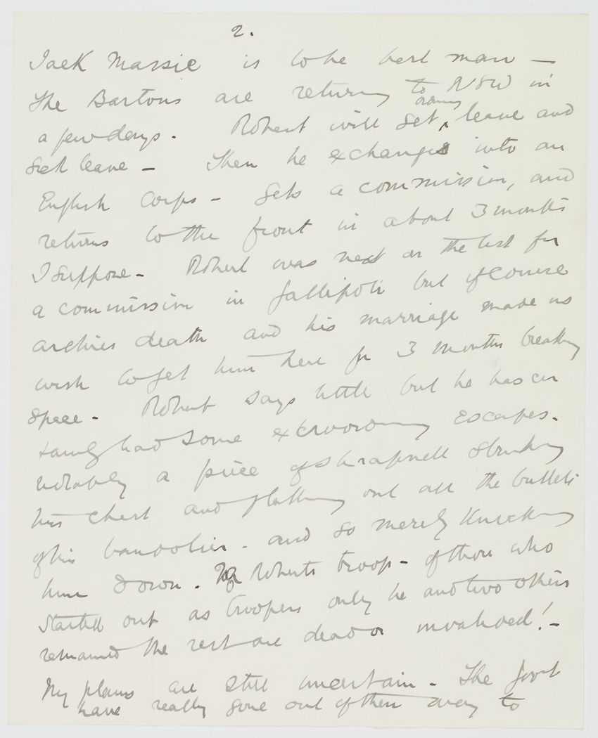 Jack Massie is to be here man – The Bartons are returning to NSW in a few days. Robert will get [indecipherable] leave and sick leave – Then he exchanges into an English Corps – gets a commission, and returns to the front in about 3 months I suppose – Arthur was next on the list for a commission in Gallipoli but of course Archies death and his marriage made us wish to get him here for 3 months breathing space. Robert says little but he has us having had some extraordinary escapes, notably a piece of shrapnel striking his chest and flattening out all the bullets of his bandolier – and so merely knocking him down. M White troops – of those who started out as troopers only he and two others remain the rest are dead or invalided! –