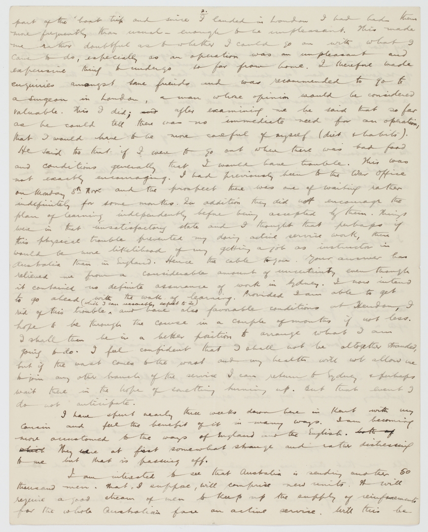 part of the boat trip and since I landed in London I had had them more frequently than usual – enough to be unpleasant. This made me rather doubtful as to whether I could go on with that I came to do, especially as an operation was an unpleasant and expensive thing to undergo so far from home. I therefore made enquiries amongst some friends and was recommended to go to a surgeon in London, a man whose opinion would be considered valuable. This I did, and after examining me he said that so far as he could tell there was no immediate need for an operation, that I would have to be more careful of myself (diet & habits).He said too that if I were to go out where there was bad food and conditions generally that I would have trouble. This was not exactly encouraging. I had previously been to the War Office on Monday 8th Nov and the prospect there was one of waiting rather indefinitely for some months. In addition they did not encourage the plan of learning independently before being accepted by them. Things were in that unsatisfactory state and I thought that perhaps if this physical trouble prevented my doing active service work, there would be more likelihood of my getting a job as instructor in Australia than in England. Hence the cable to you. Your answer has relieved me from a considerable amount of uncertainty even though it contained no definite assurance of work in Sydney. I now intend to go ahead with the work of learning. Provided I am able to get rid of this trouble (which I can reasonably expect to do) and have also favourable conditions at Hendon, I hope to be through the course in a couple of months if not less. I shall then be in a better position to arrange what I am going to do. I feel confident that I shall not be altogether stranded, but if the worst comes to the worst and my health will not allow me to join any other branch of the service I can return to Sydney & perhaps wait there in the hope of something turning up. But that event I do not anticipate.