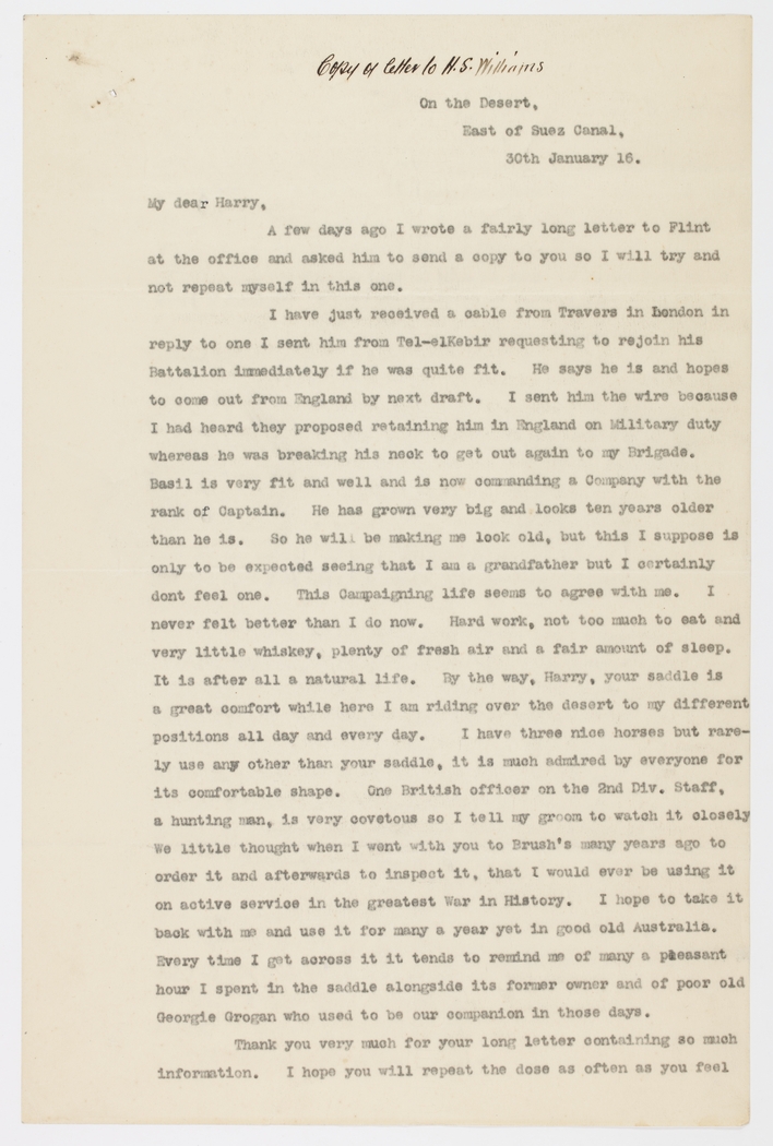 This campaigning life seems to agree with me. I never felt better than I do now. Hard work, not too much to eat and very little whiskey, plenty of fresh air and a fair amount of sleep. It is after all a natural life. By the way, Harry, your saddle is a great comfort while here I am riding over the desert to my different positions all day and every day. I have three nice horses but rarely use any other than your saddle, it is much admired by everyone for its comfortable shape. One British officer on the 2nd Div.Staff, a hunting man, is very covetous so I tell my groom to watch it closely. We little thought when I went with you to Brushs's many years ago to order it and afterwards to inspect it, that I would ever be using it on active service in the greatest war in history. I hope to take it back with me and use it for many a year yet in good old Australia. Every time I get across it it tends to remind me of many a pleasant hour I spent in the saddle alongside its former owner and of poor old Georgie Grogan who used to be our companion in those day.