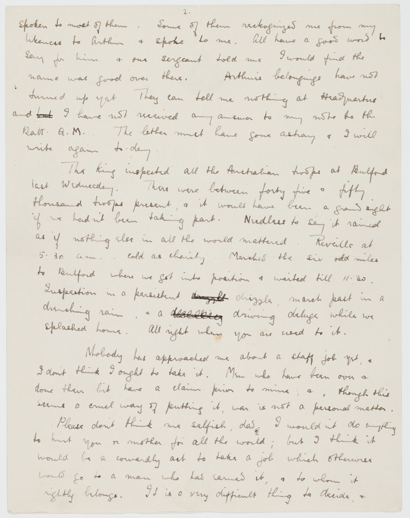 The King inspected all the Australian troops at Bulford last Wednesday. There were between forty five and fifty thousand troops present, and it would have been a grand sight if we hadn't been taking part. Needless to say it rained as if nothing else in all the world mattered. Reveille at 5.30 am. cold as charity. Marched the six odd miles to Bulford where we got into position and waited till 11.30. Inspection in a persistent drizzle, march past in a drenching rain, and a driving deluge while we splashed home. All right when you are used to it.