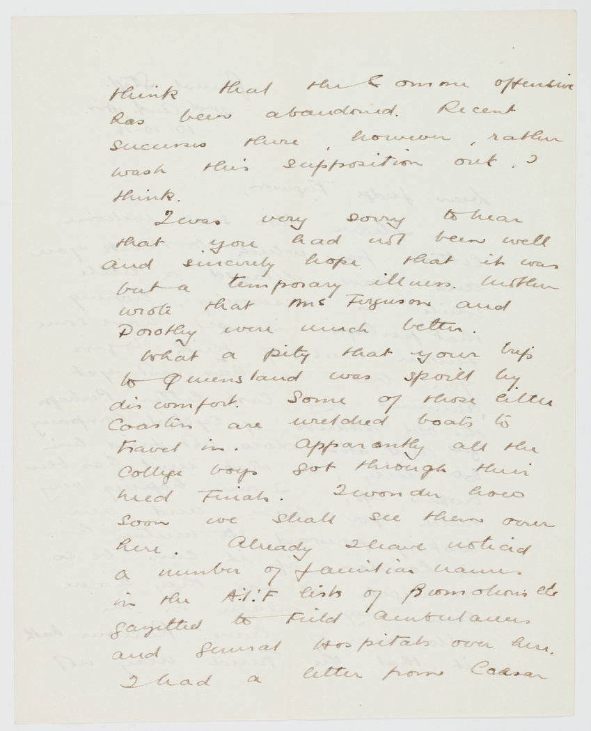 What a pity that your trip to Queensland was spoilt by discomfort. Some of those little coasters are wretched boats to travel in. Apparently all the college boys got through their med finals. I wonder how soon we shall see them over here. Already I have noticed a number of familiar names in the A.I.F. list of promotions etc. gazetted to Field Ambulances and general Hospitals over here. I had a letter from Caesar