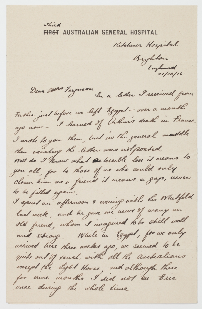 5In a letter I received from Father just before we left Egypt – over a month ago now – I learned of Arthur's death in France. I wrote to you then, but in the general muddle then existing the letter was not posted.