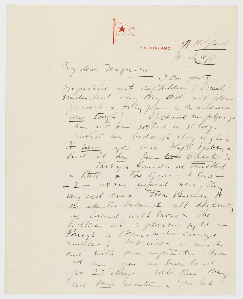 Through Canada we travelled in state. The Government cars – 2 – at our disposal & everything very well done. From Vancouver to the Atlantic seaboard all the country is covered with snow. The Rockies are a glorious sight – through a steam-heated window. But when as was the case with some unfortunates whom we saw, you are snow bound for 23 days. Well then they are some mountains. You bet