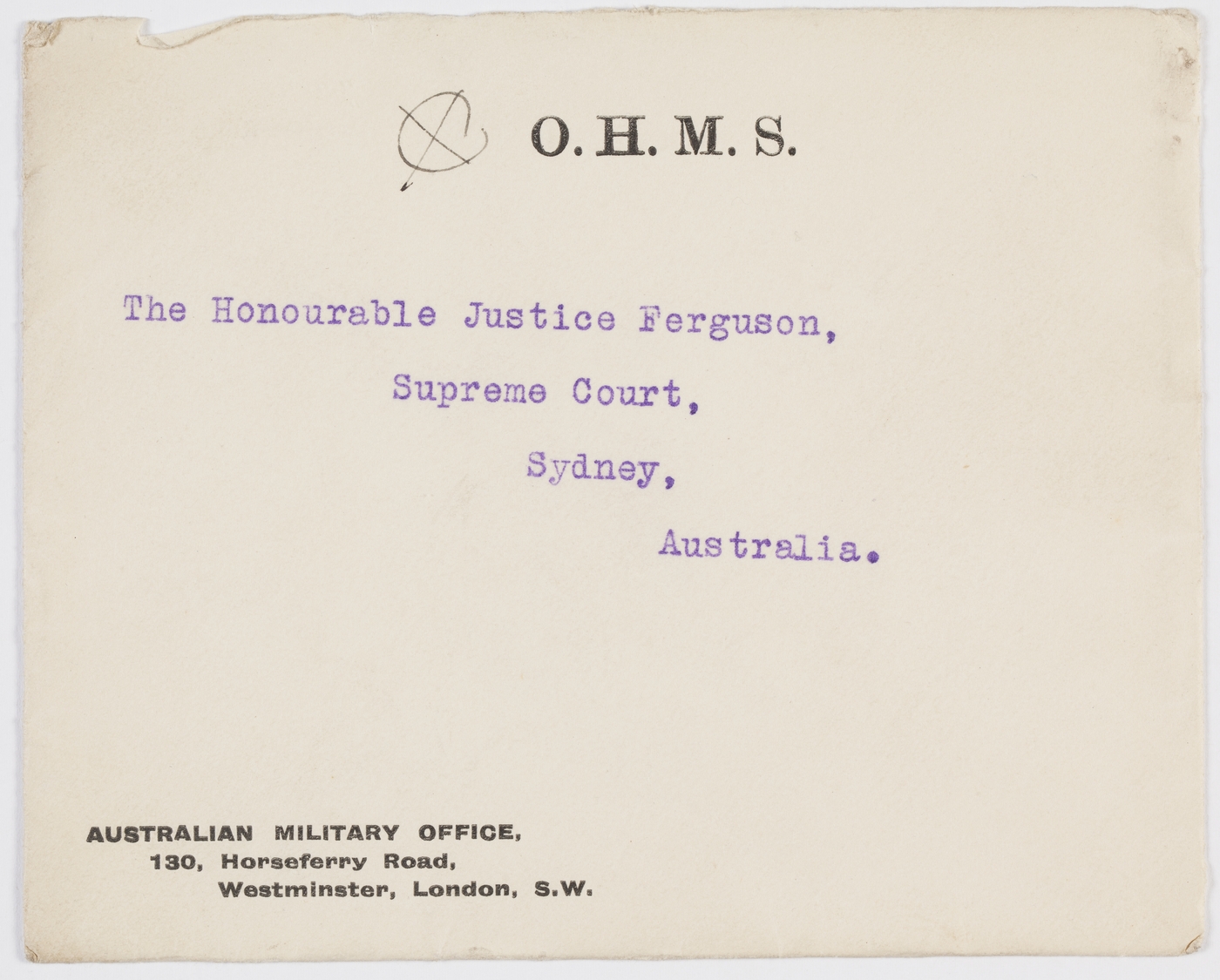 [Envelope marked - Australian Military Office, 130, Horseferry Road, Westminster, London, S.W.]The Honourable Justice Ferguson,Supreme Court,Sydney,Australia.